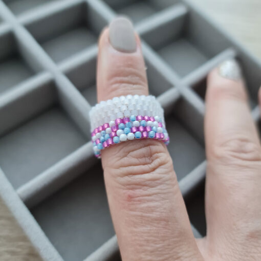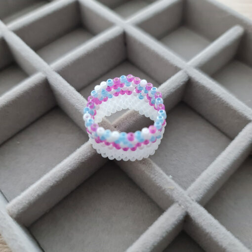 This colourful and playful ring will bring freshness and youthful energy to your style. Handcrafted from high quality white, pink and blue glass beads. The perfect accessory for those who love expressive and colourful jewellery, adding a fun and vibrant accent to any outfit.