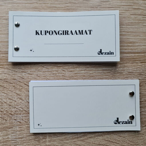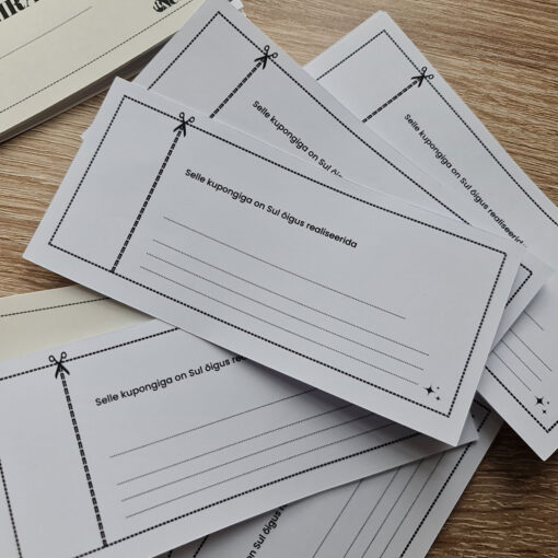 Alusta isikliku puudutuse lisamist juba kaanest, kuhu saad kirjutada saaja nime. Lisaks on tagakaanel ruumi pühenduse või väikese joonistuse jaoks. Tugevamast paberist kaaned mitte ainult ei kaitse loodud kuponge, vaid lisavad ka elegantsi ja vastupidavust. Terve kupongiraamat on loodud mõnusast paberist, millele saad mugavalt kirjutada nii pastaka, vildika kui ka pliiatsiga.