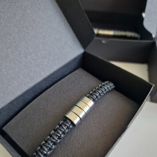 Käevõru on käsitsi punutud vastupidavast vahapaelast ning selle reguleeritav suurus sobib mugavalt igale randmele.