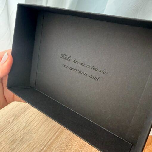 Saad lisada oma sõnumi, mille me graveerime karbi kaane alla (+5€). See on nähtav ainult inimesele, kellele kingituse annad ;)