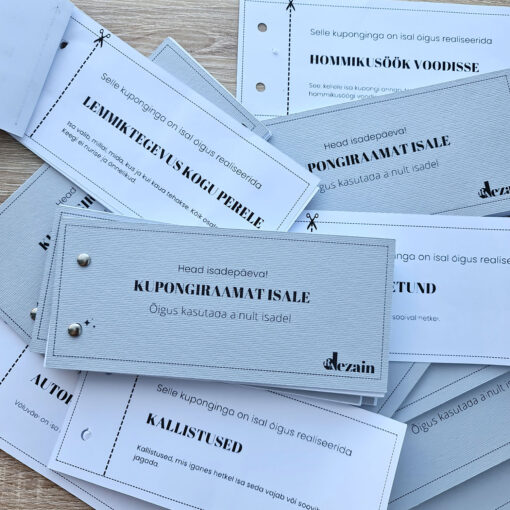 Isadepäeva kingitus, mis on nii südamlik kui ka praktiline? See on kupongiraamat, mis on loodud just isadele! Kupongiraamat sisaldab 10 erinevat kupongi, mida sinu pere isa saab kasutada kokkulepitud perioodi jooksul. Olgu selleks siis eriline õhtusöök, vaikusetund või sissemagamise hommik – isa saab ise otsustada, millist kupongi ja millisel hetkel kasutada. Isadepäeva kupongiraamat sisaldab järgmisi kuponge: